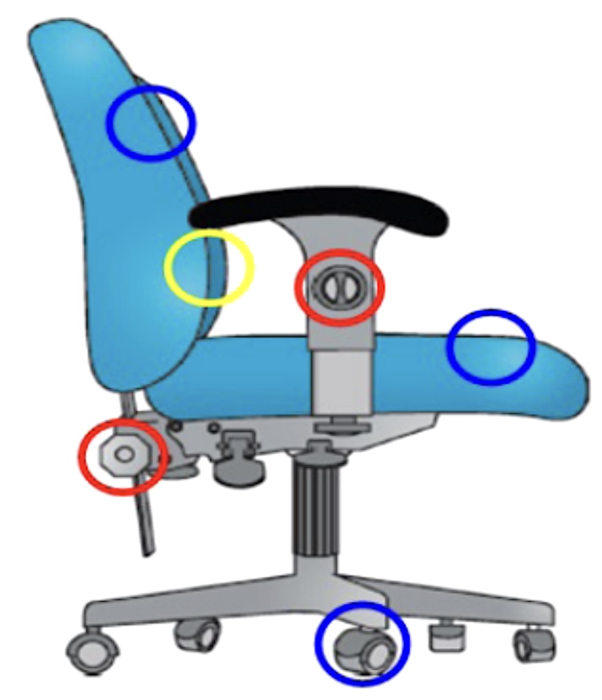 Espalda y tronco: El respaldo de la silla permite apoyar la espalda tanto en la parte superior como inferior. Para lograr esta condición, el respaldo debe estar ligeramente inclinado hacia atrás, permitiendo una descarga de peso sobre la espalda y un cierto relajamiento de la musculatura.