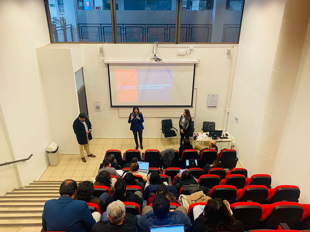 Su estructura organizacional, cuenta con 15 profesionales en la DGOA, siguiendo la proporción de un secretario académico por cada mil estudiantes. Esta capacidad ha permitido avanzar de manera sostenida y marcar el ritmo para el resto de las facultades. En estos meses, el equipo ha impulsado hitos clave como el Kick Off, Go Live, capacitaciones y reuniones internas de coordinación que han acompañado la adopción del modelo.